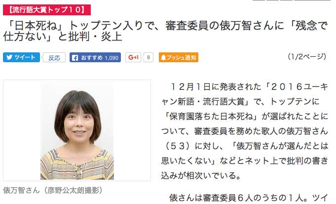 俵万智は流行語大賞で 日本死ね を推していた ツイッターにその形跡が ガールズちゃんねる Girls Channel